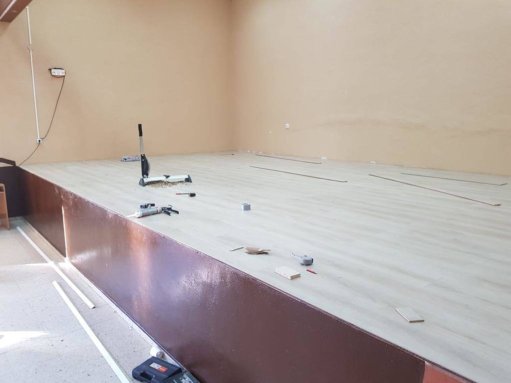 Los operarios han instalado suelo de gres porcelánico y en ... el escenario han colocado una tarima A5 de roble antihumedad y rodapié, mismo material con el que han forrado los peldaños del escenario. Al mismo tiempo han emplazado en las entradas puertas de alumninio antipánico o de emergencias.