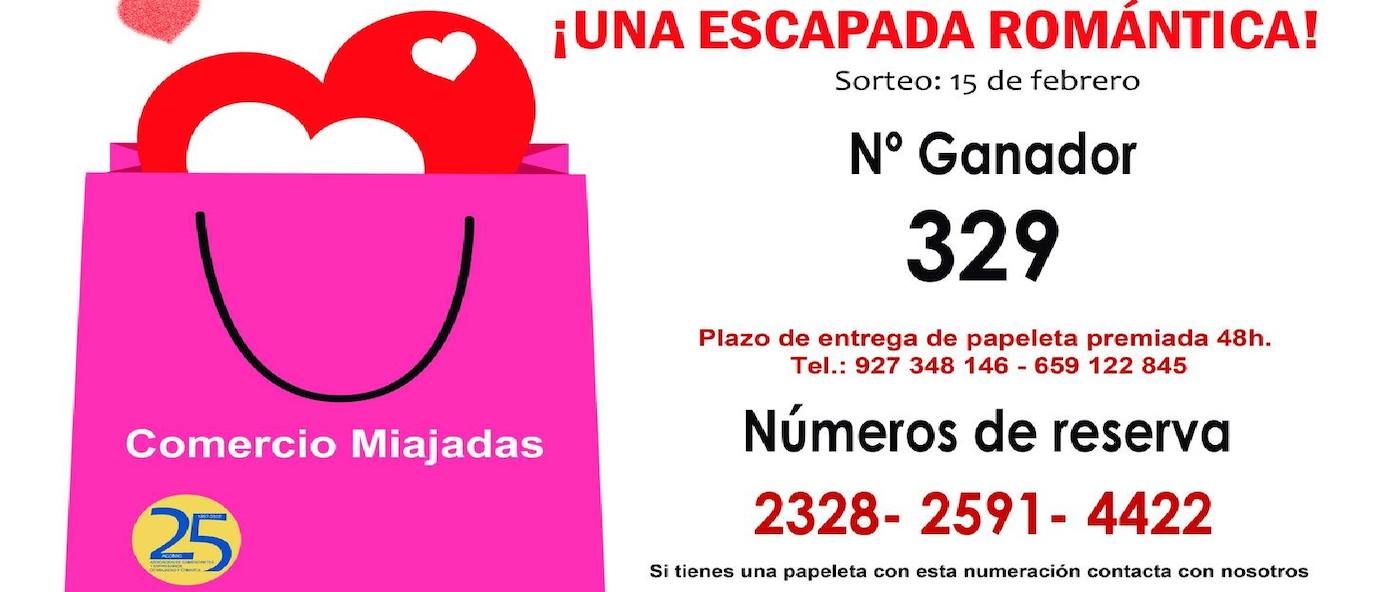 Los números de reserva son 2328, 2591 y 4422La papeleta número 329, distribuida por Deportes El Galgo, ha sido la ganadora de la escapada romántica sorteada por Acomic con motivo de la campaña ... de San Valentín 'Compra con corazón'.