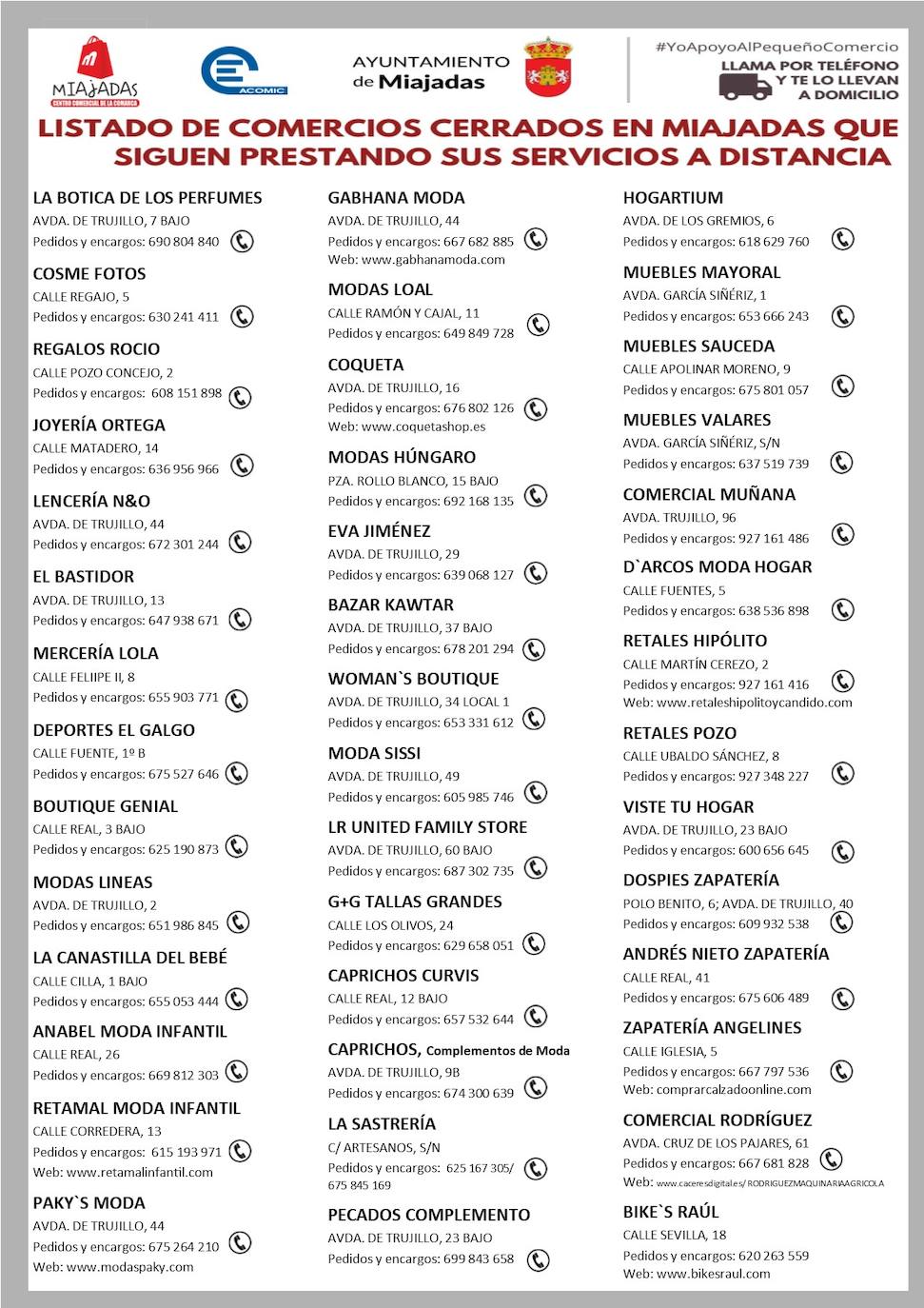 Son ... muchos los negocios que han tenido que cerrar sus puertas. Sin embargo, continúan al servicio de sus vecinos y clientes. Por ello, la Concejalía de Comercio y Agencia de Empleo y Desarrollo Local, en colaboración con la Asociación de Comerciantes y Empresarios de Miajadas y Comarca, ha hecho público un listado de los comercios que, a pesar de estar cerrados al público, siguen trabajando de forma online y a distancia, para que todos sus clientes puedan satisfacer sus necesidades. (Listado comercios cerrados que prestan servicio a distancia y gráfico al final del artículo)