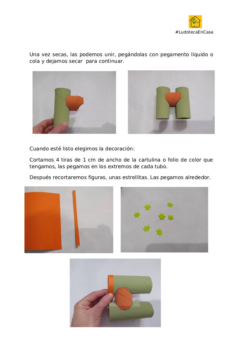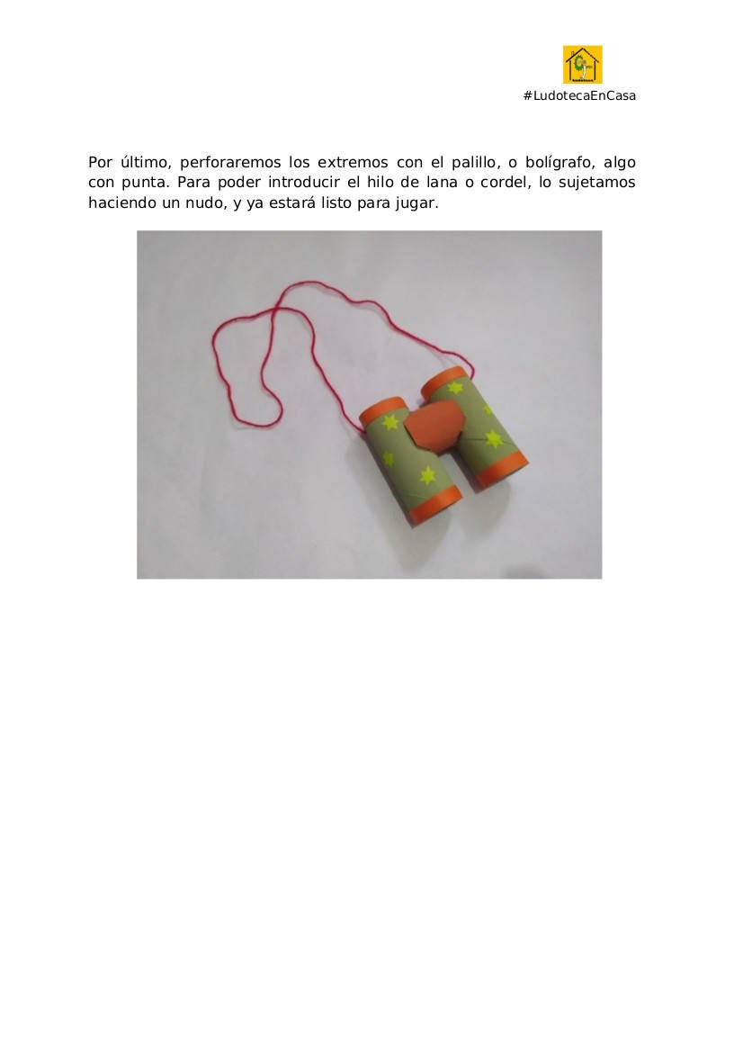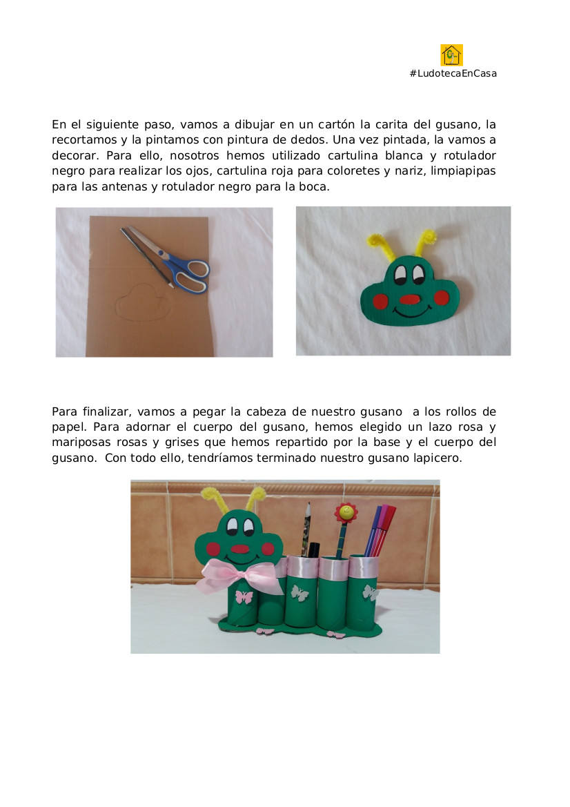 También podrán fabricar un lapicero con forma de gusano para tener ordenados sus lápices a la hora de hacer los deberes o entretenerse en casa coloreando y dibujando, todo con material recicladoLos dinamizadores juveniles de las Ludotecas de Miajadas, Alonso de Ojeda y Casar de Miajadas proponen esta semana a sus alumnos fabricar sus propios prismáticos ... para observar mejor el paisaje cuando salen a pasear.