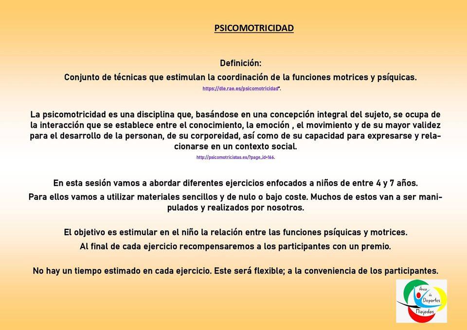 El técnico deportivo Javier Ramiro explica cómo trabajar las funciones psíquicas y motrices utilizando materiales caserosEl Área de Deportes de Miajadas y sus técnicos continúan ofreciendo alternativas a los vecinos, en esta ocasión la sesión va dirigida a trabajar la ... psicomotricidad de los más pequeños de entre 4 y 7 años.