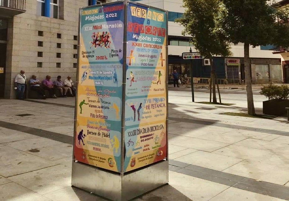 La Plaza de España de Miajadas luce un tótem en el que se publicitarán las actividades deportivas que habrá en la localidad durante las próximas ... semanas.