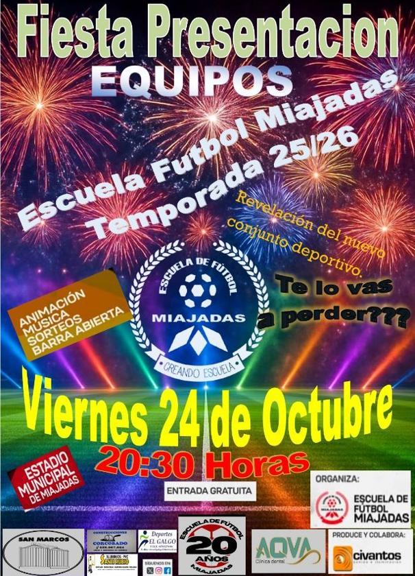 El próximo viernes, día 24 de octubre, el Campo Municipal de Fútbol de Miajadas acogerá, a partir de las 20.30 horas, la presentación de la Escuela de Fútbol de Miajadas. Será una jornada muy especial en la que además se celebrarán los 20 años de vida de la escuela.