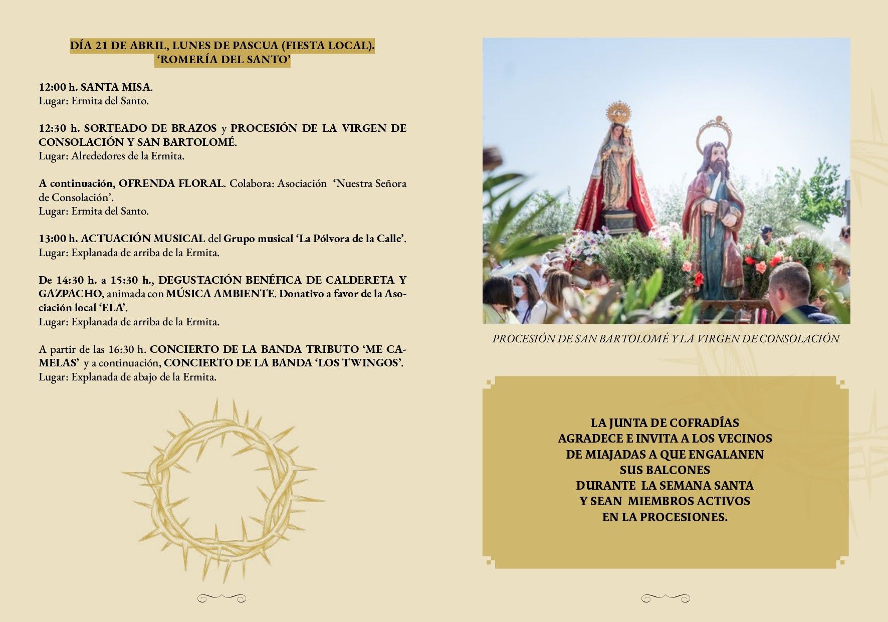 El Lunes de Pascua, festivo local, se celebrará en la ermita del Santo la santa misa y la procesión en honor a la Virgen de la Consolación y a San Bartolomé.