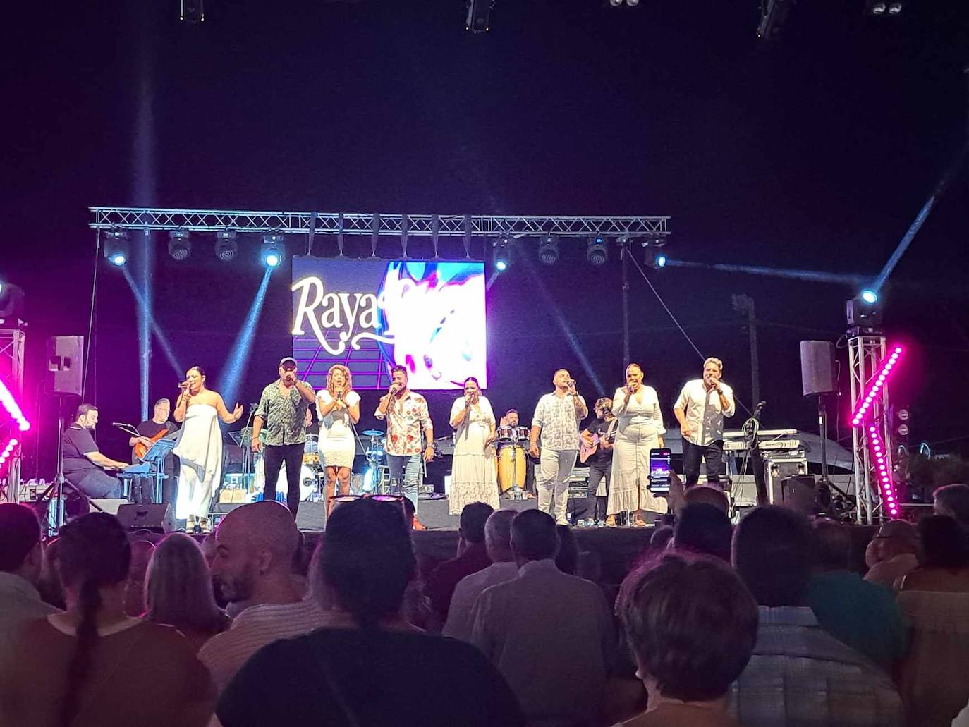 Tras finalizar los fuegos artificiales, Raya Real salió al escenario para cantar temas tan conocidos y variados como la Salve Rociera, Bamboleo Popurrí, Vivir mi vida de Marc Anthony o la versión 'españolizada', como definen ellos mismos, de Hawai, de Maluma, sacando a bailar a la pista a muchos de los presentes en la caseta municipal.