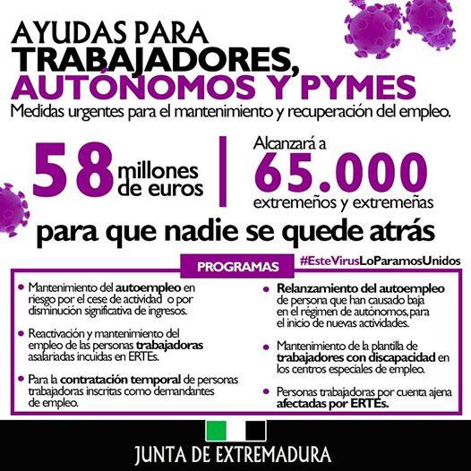La Junta de Extremadura destinará 58 millones de euros para llevar a cabo medidas urgentes para el mantenimiento y recuperación del empleoLos trabajadores, autónomos y PYMEs afectados por la crisis económica derivada del COVID-19 ya pueden solicitar una serie de ayudas ofertadas por la Junta ... de Extremadura, que destinará 58 millones de euros para llevar a cabo medidas urgentes para el mantenimiento y recuperación del empleo.