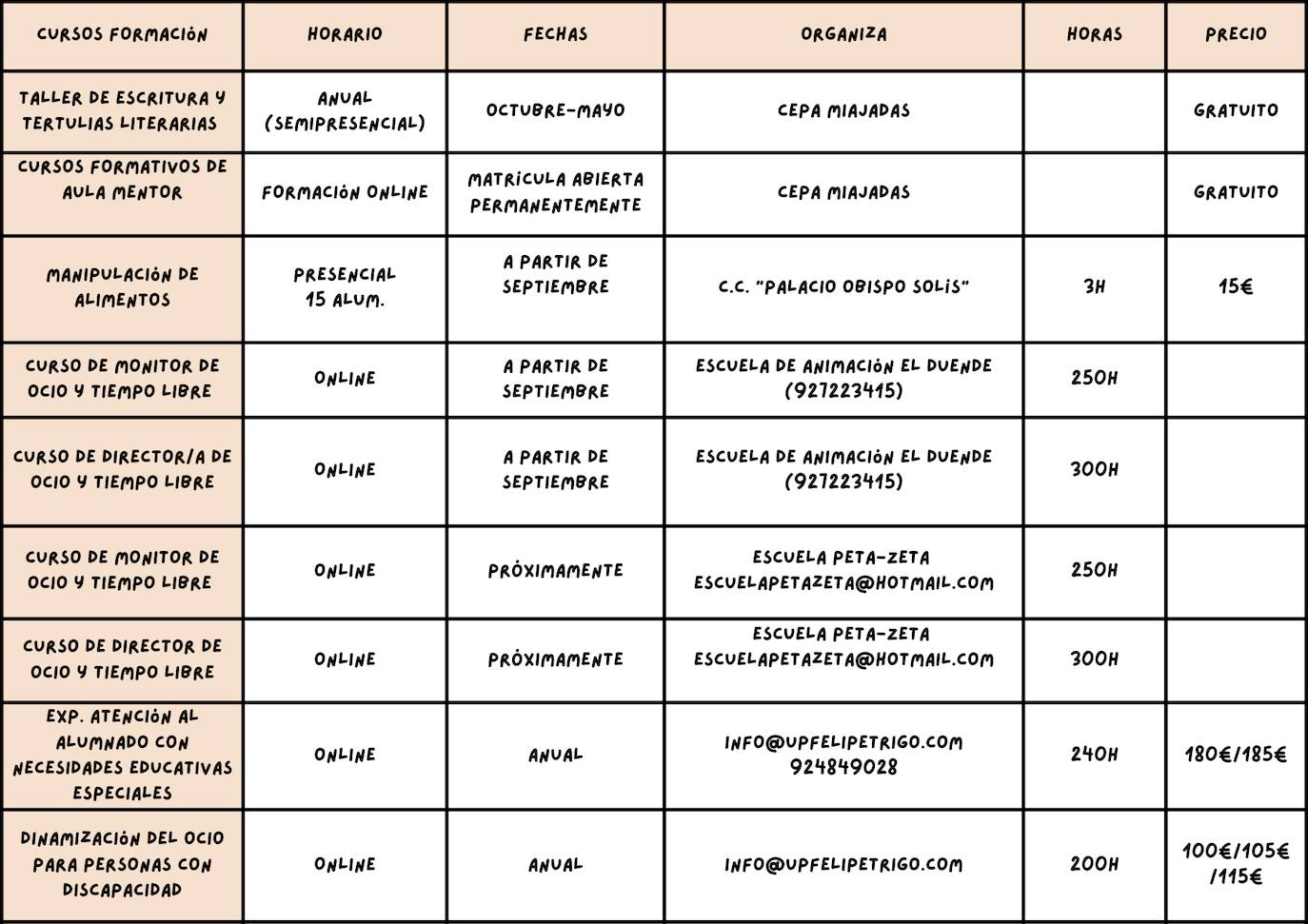 Los cursos consistirán en Dibujo y pintura, Corte y confección, Flamenco, Sevillanas y rumba, Escritura y tertulias literarias, Manipulación de alimentos, Monitor o Director de ocio y tiempo libre, Dinamización del ocio para personas con discapacidad, curso formativo de Aula mentor, Atención al alumnado con necesidades especiales y curso de Lengua de signos en español.