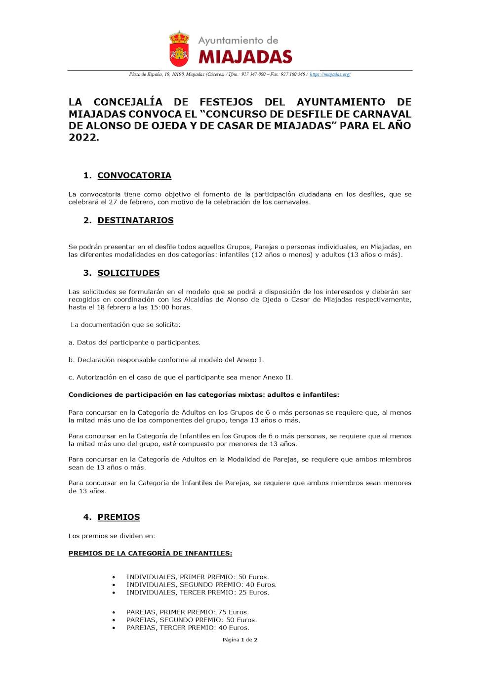 Bases Desfile de Carnaval Alonso de Ojeda y Casar de Miajadas